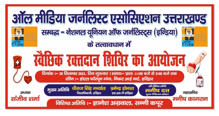 ऑल मीडिया जर्नलिस्ट एसोसिएशन उत्तराखंड( अमजा) का स्वैच्छिक रक्तदान शिविर 28 सितंबर 2023 को हरिद्वार इकाई के तत्वावधान में रक्तदान शिविर का आयोजन किया जा रहा है।